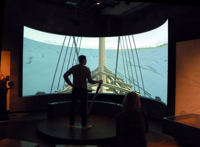 Ships. Trade. Colonization. War. Slaves. These glowing circles each have a miniature ship inside them, and a little background story. The contrast between the old building and the new building is quite obvious. But I guess they weren't trying to look like the place is one piece. Here, you can learn knotting, and view a big collection of ships/boats/floating machines. They didn't have a pirate ship though..