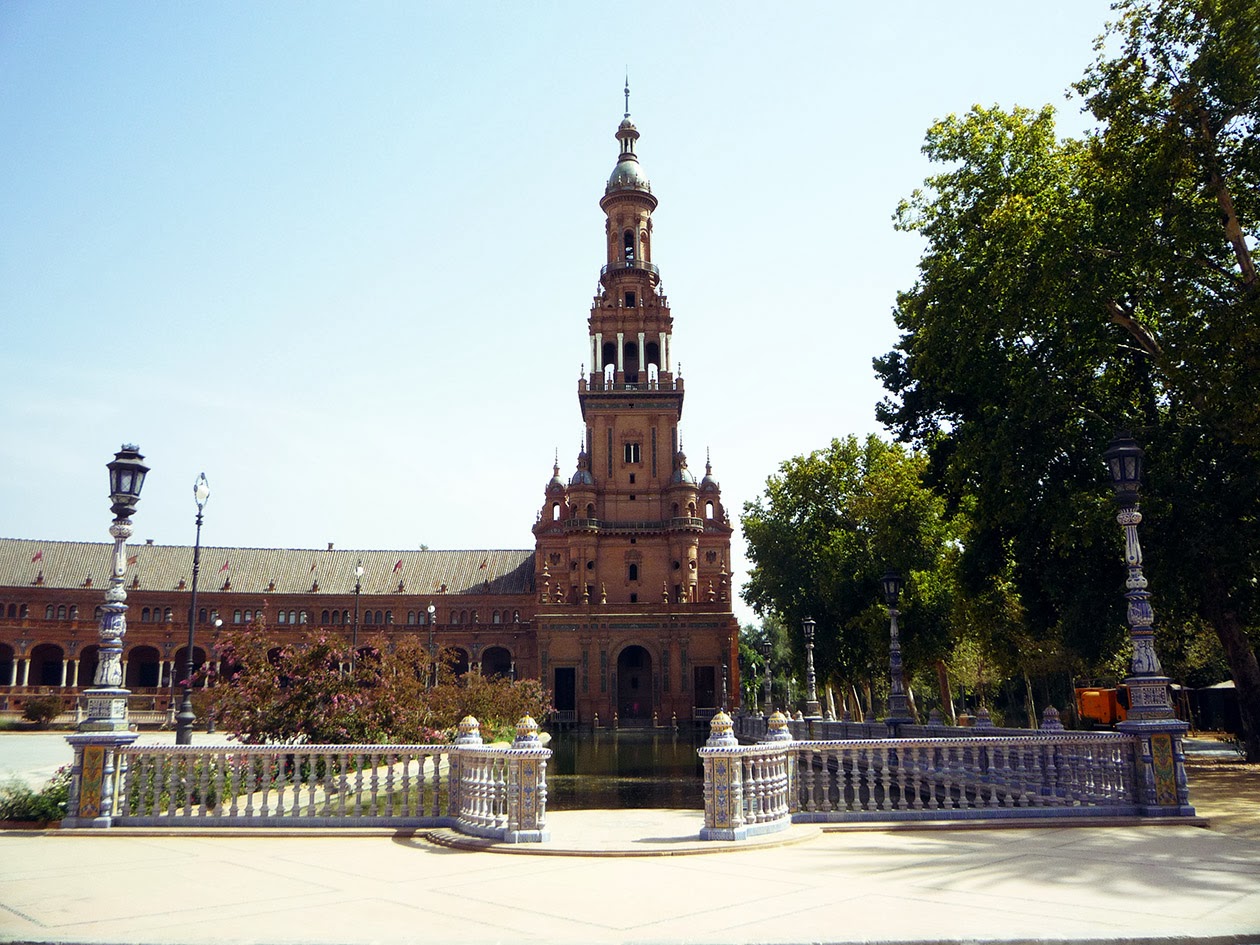 Plaza de España! It was built for an exposition many years ago and today it stands around lookin' pretty grand. It was also the set for Star Wars I and II. It's a pity it was siesta time, otherwise I could take my time here. The front courtyard was fairly vast, so I survived about a minute before running for shade. What's even more crazy was this tourist family on a little boat rowing their way across the pond/moat above. First of all, you can't get anywhere because the pond is a circle, and second of all, there is no shade for the poor family in the boat, unless perhaps they park under the bridge. No hat could save you here.